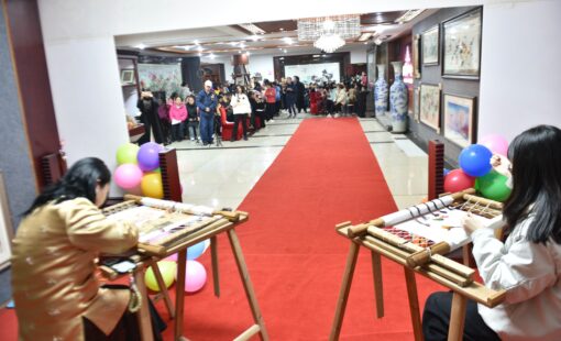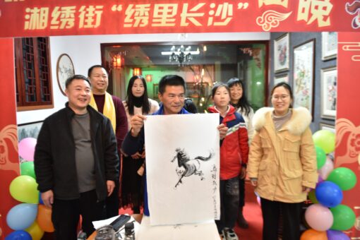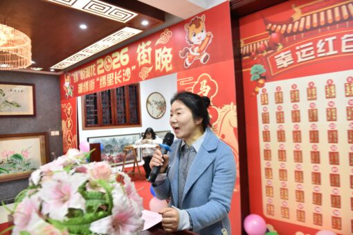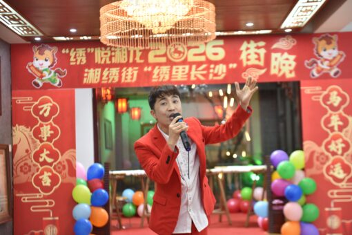 走进湖南湘绣城里的“湘绣街会客厅”,厅里人头攒动,人人脸上喜气洋洋。记者看到,在“绣”悦湘龙2026湘绣街“绣里长沙”的《街晚》活动现场,长沙县湘绣文化产业促进会党支部书记、秘书长文舜正在担任迎新晚会的主持。