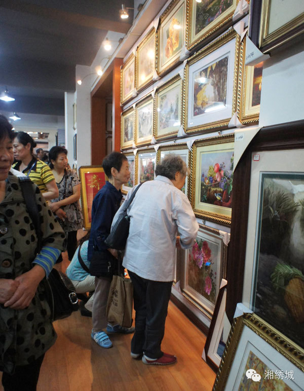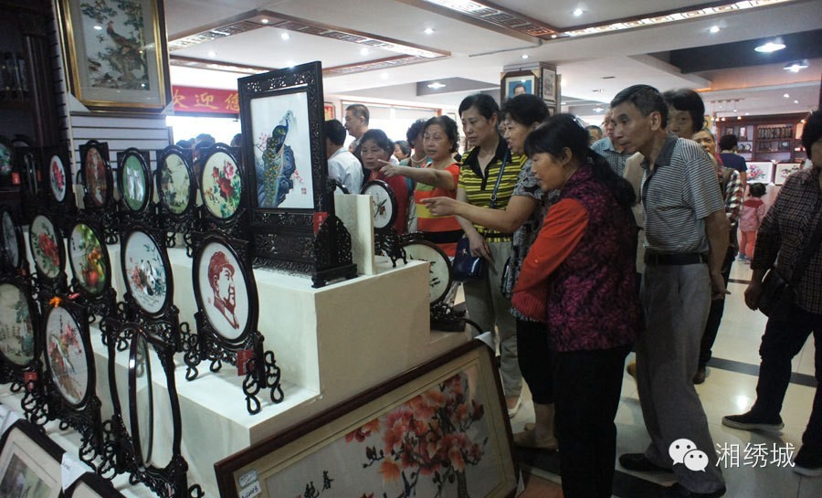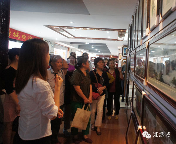 老人们在仔细欣赏着这精美的湘绣作品
