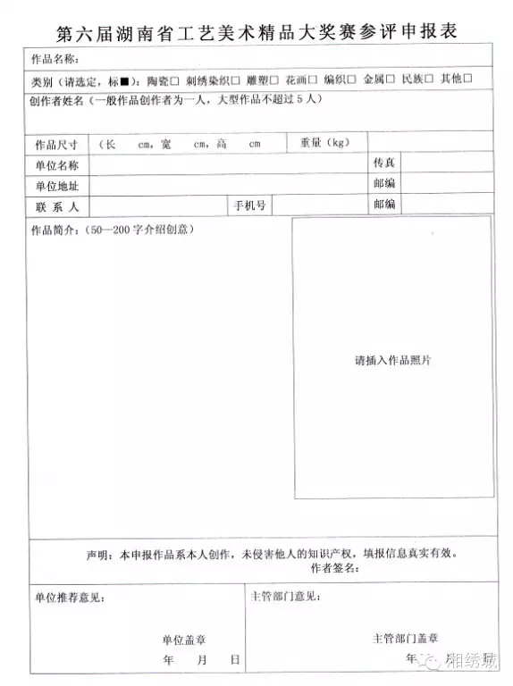 (1)参赛作品必须是参加第五届湖南省工艺美术品博览会的实物展品;